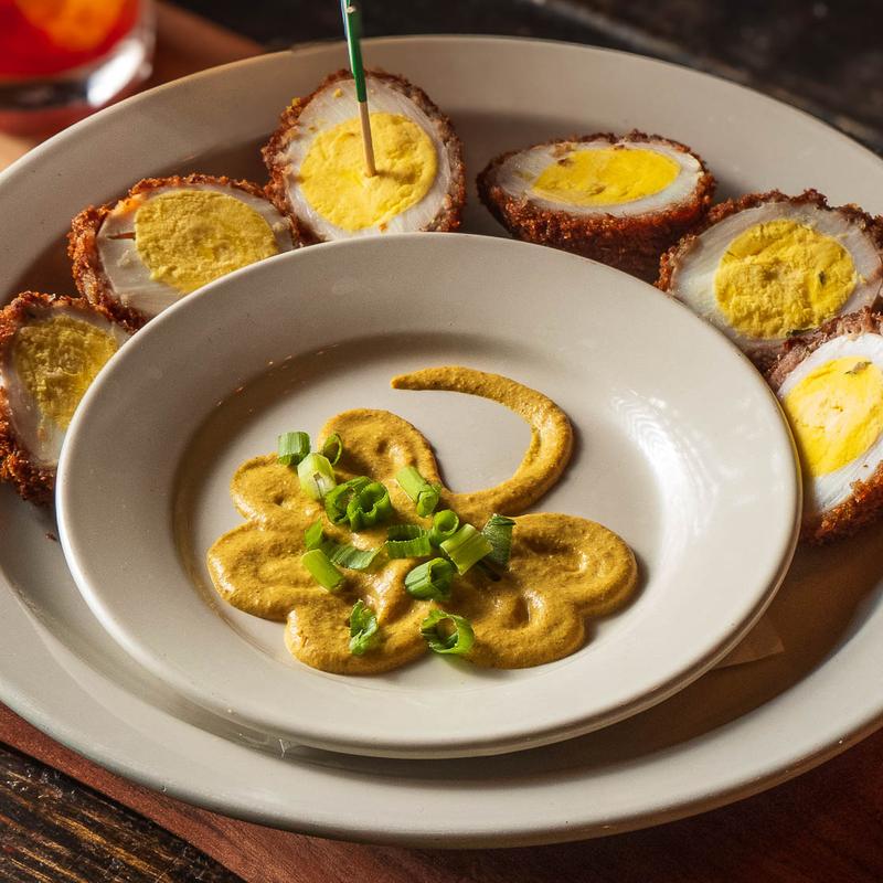 Award winning, local favorite | Six half eggs boiled and covered in sausage and panko