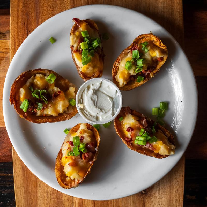 Stuffed skins with cheddar, bacon, scallions with sour cream